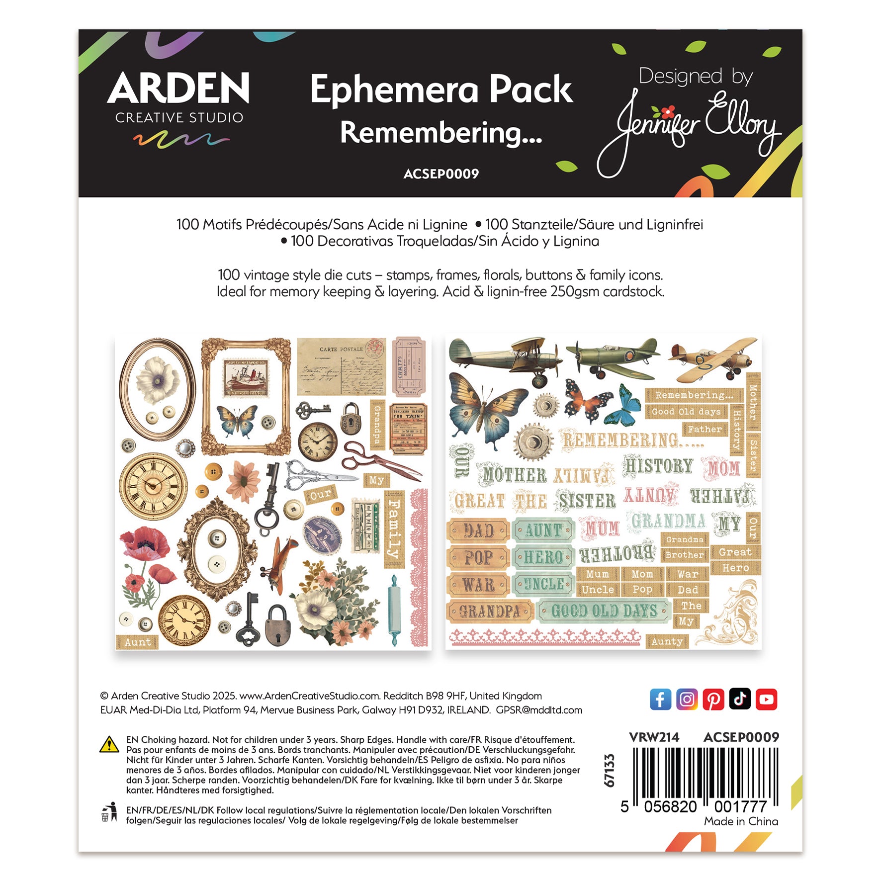 Add timeless charm to your projects with the Remembering… Collection Ephemera Pack from Arden Creative Studio, designed by Jennifer Ellory. This carefully curated pack features 100 die-cut pieces in assorted sizes, crafted from durable 250gsm acid- and lignin-free cardstock. Coordinating perfectly with the Remembering… Collection, the ephemera includes nostalgic motifs such as postage stamps, watch faces, vintage frames, poppies, buttons, planes, and family relationships like Mum, Dad, and more - ideal for creating family trees or capturing precious family memories.